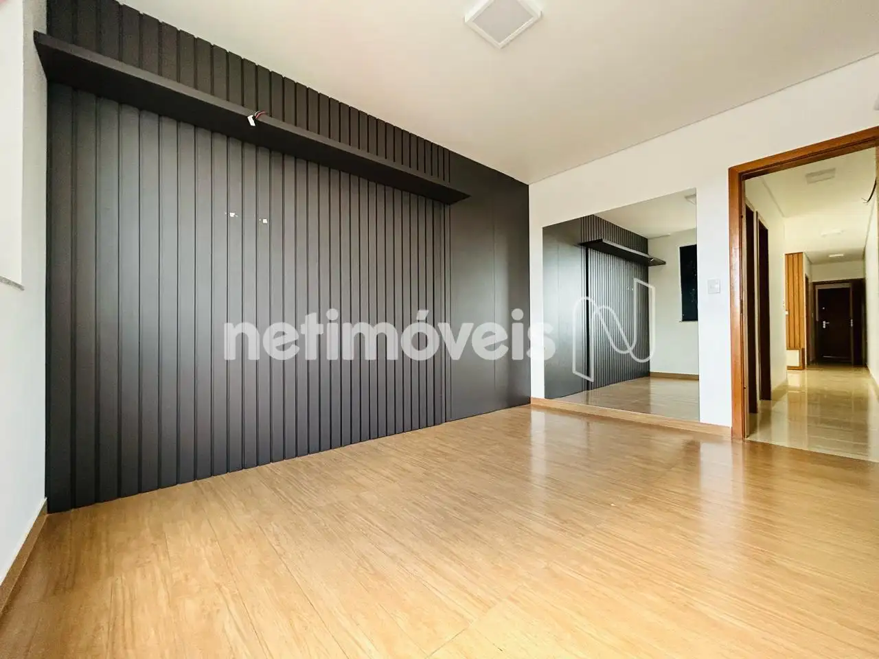 Sala ampla com painel planejado, com piso em porcelanato