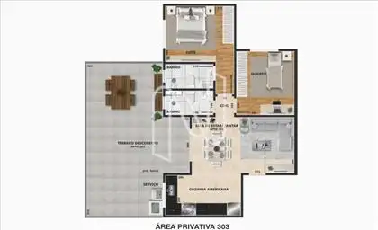 - Apartamento com sala para 2 ambientes, cozinha estilo americana com área de serviço, 2 quartos sendo 1 suíte, banho social e 2 vagas de garagem em linha. Piso em cerâmica nas salas e quartos, revestimento parcial nas áreas molhadas, preparação de laje técnica para ar-condicionado na suíte, tanque em louça, pias, lavatórios e bancadas em granito.