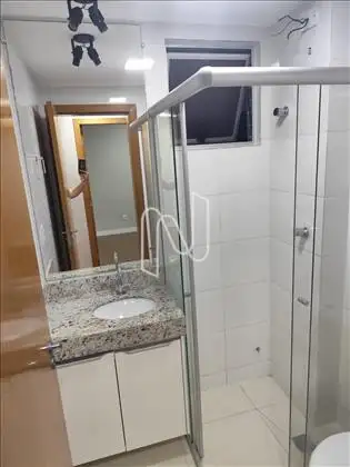 - Banheiro social com box, armário e espelho;
