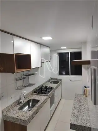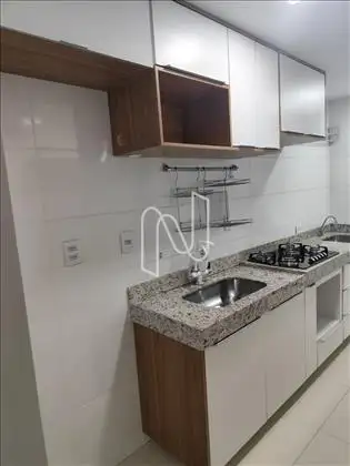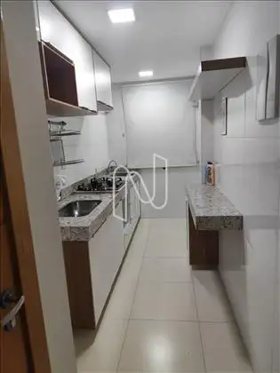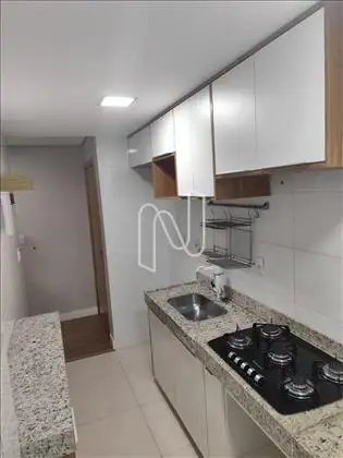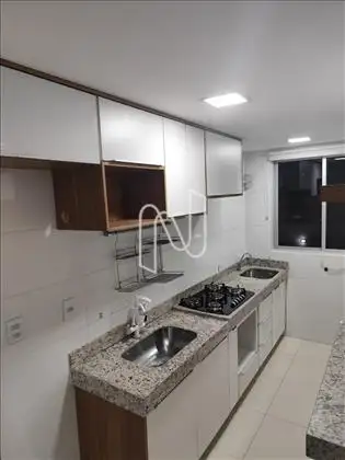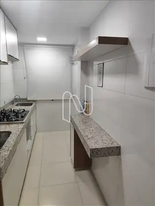 - Cozinha com armários, cooktop, bancada e conjugada com área de serviços;
