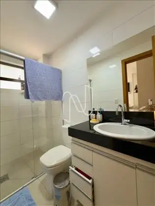 Banho suíte com armários, box blindex, piso e bancada em granito.